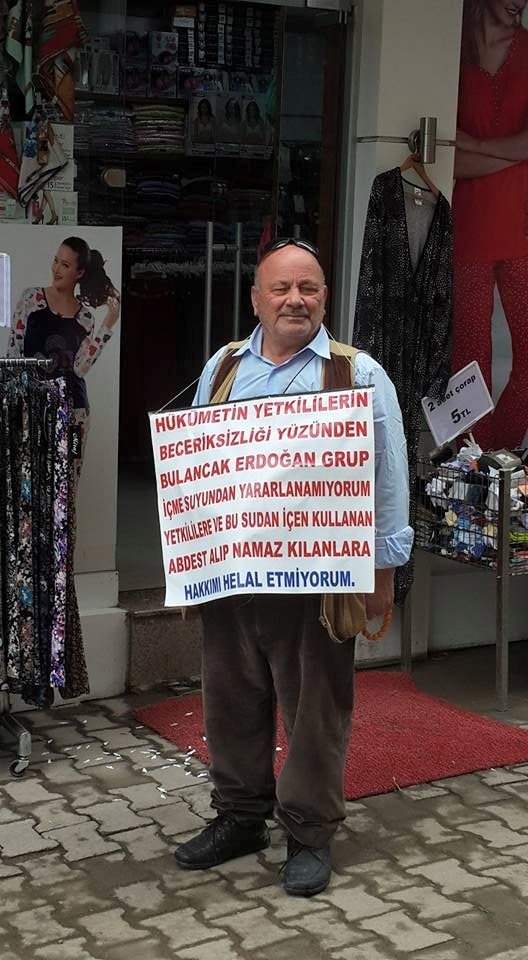 “HÜKÜMETİN,YETKİLİLERİN BECERİKSİZLİĞİ YÜZÜNDEN BULANCAK ERDOĞAN GRUP İÇME SUYU’NDAN YARARLANAMIYORUM. YETKİLİLERE VE BU SUDAN İÇEN KULLANAN, ABDEST ALIP NAMAZ KILANLARA HAKKIMI HELAL ETMİYORUM”.
