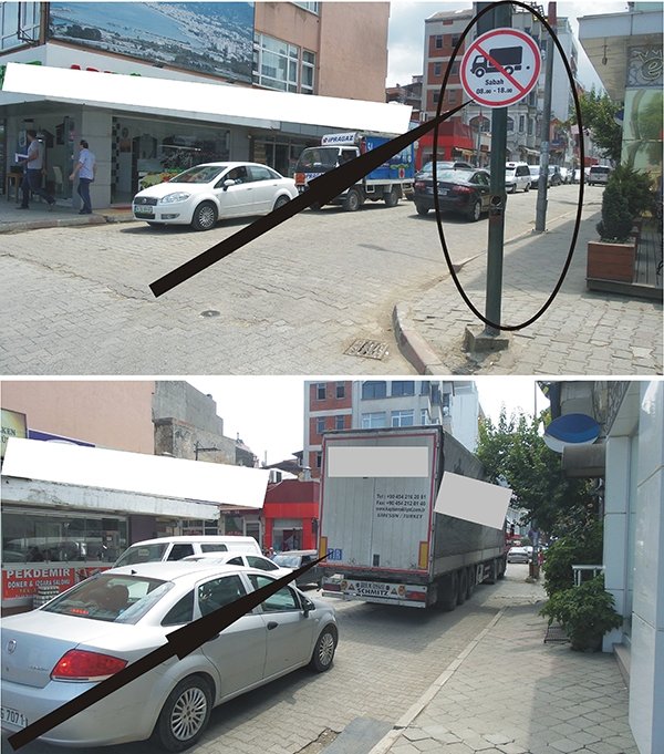 Yaya ve araç trafiğinin özellikle şehir içine giriş olduğu iskele mevkiinde bulunan levhayı yok sayması ve dikkate almaması bırakın şehir içine kamyon girmesini, uzun tır araçlarının çok rahat ve levhaları umursamaz hareketleri objektiflerimize yansıdı.