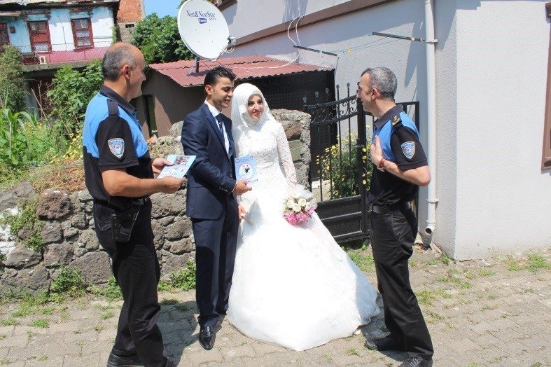 Giresun İl Emniyet Müdürlüğü’nce “Düğünümüzde Silah Kullanılmasını İstemiyoruz”sloganından yola çıkarak hazırladığımız “SİLAHLI SEVİNCE HAYIR” isimli broşür ve afişlerin düğün salonlarına, düğün davetiyesi bastırılan matbaa ve organizasyon şirketlerine, nikâh tarihi almaya gelen vatandaşlara dağıtılmak üzere Belediye Nikâh Daireleri ile gerekli yerlere dağıtım çalışmalarımız devam etmektedir. Çalışma kapsamında İl Müftülüğü ile temasa geçilerek Cuma Namazında cami cemaatine verilen hutbe ve vaazlarda başarı ve sevinçli anlarımızda silah kullanılmasının önlenmesi hususunda vatandaşların bilgilendirilmesi sağlanmaktadır.
