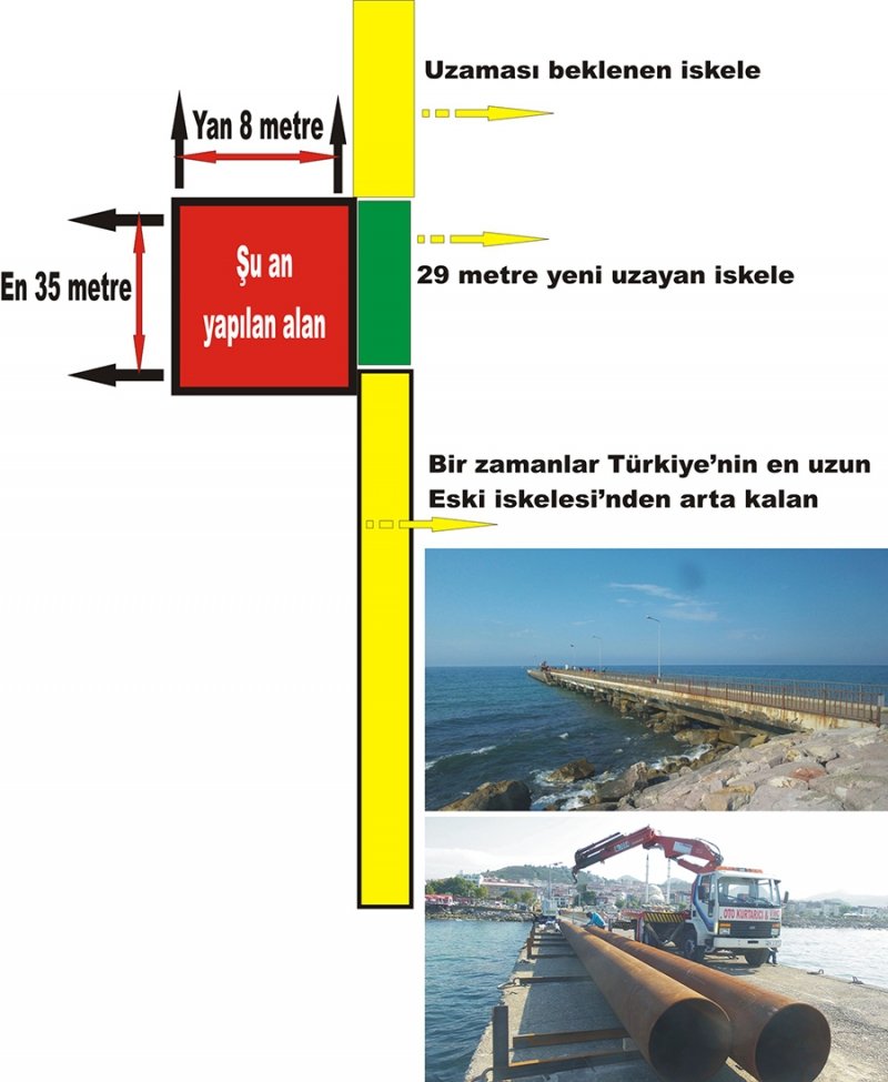 İskelenin yeni ucundan 8 metre yana ve eski iskele betonuna kadarda içeriden 35 metre en olarak genişletileceği öğrenildi.