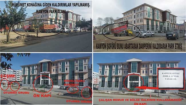 Mustafa Kemal Ulusu Caddesi üzerinde bulunan Hükümet Konağı yolunun kaldırımlarının yapılmaması ve cevresinde ki inşaatların düzensiz ve özentisiz çalışması objektiflerimize böyle yansıdı. Bir diğer çirkin ve pis görüntü ise kamyon parkı gibi kullanılması birde inşaat alanlarının cevresinin belirsizliği, düzensizliği ayrıca yolun belirsizliği görüntüsü açıkça görülmektedir. Hükümet Konağı’nın cevresine kamyon çekilmesinin ötesinde, kamyon şoförünün bunu abartarak damperini kaldırarak aracını park etmeside neyin nesi anlayamadık.