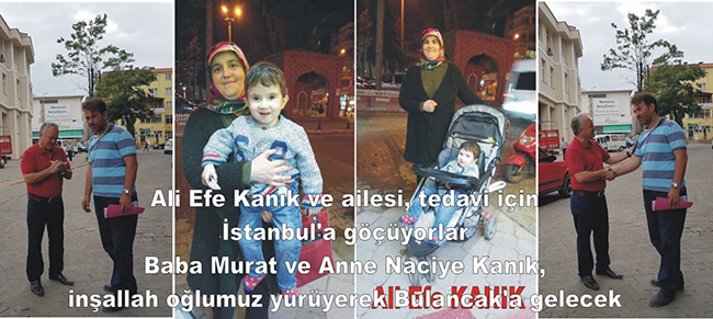 “Ali Efe Kanık’ın HİDROSEFALİ MENİNGO MYOLESEL yanı kafa büyümesine karşın kafasının içine tüp konularak bu hastalığı önlerken bir diğer hastalığı OPERE SPİNA BİFİDA yanı yürüyememe için mutlaka İstanbul’a tedavi görmesi gerektiği vurgulandı. Kafa büyümesini durduran aile şimdi de, Ali Efe Kanık’ın OPERE SPİNA BİFİDA yanı yürüyememe hastalığı için umudun olduğu İstanbul’a yerleşmesi gerekiyor. Baba Kanık, İstanbul’da iş bulduğu fakat imkanlarının İstanbul’a evini ve ailesini ilk etapda getirmenin şu anda kendisi için zor olduğu belirtildi. Kanık ailesinin 2 kız ve bir de erkek evlatları için düzenini bozarak, imkanlar doğrultusunda Ali Efe için İstanbul’a yerleşmesi gerçeği ile karşı karşıya kaldıkları görüldü. Oğlumuzun tedavisi için yardım severleri bize değil oğlumuzun hastalığıyla ilgili olarak bizlere yardım etmesini istiyoruz. Doktorların şayet İstanbul’da uzun süreli tedavi görürse yürüyebileceği umudu bizleri ve ailemizi oldukça heyecanlandırdı. Baba Murat ve anne Naciye Kanık, Ali Efe oğlumuzun bu hastalıktan kurtulma şansının var olması ve beklemek zorunda kalmamız, ekonomik sebeplerden dolayı İstanbul’a gidemememiz bizi çok zor durumda bırakıyor” demişti.