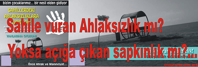 Birde çözüm sunuyor olup biten bu sözde ahlaksızlığa. Hani kendince bu ahlaksız gençlere haddini bildirmeye çalışıyor. Ahlaksızlıkla suçlanan gençleri tanıyorsanız adını savcılarımıza, emniyet güçlerimize verin ama sahilde ki ticaret’HAN’ler hariç...Bunun altını çizelim. Güya sahildeki kafelerden denizi seyretmede yada yan yana oturmaya bir şey diyemeyiz demeye getiriyor. Belki de genlerine kapalı kapılar ardına karışmayız refleksi yerleşmiştir.