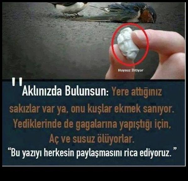 Ayrıca bir diğer sorun da, yere attığımız sakızları kuşlar yemek sanarak yiyince ölüyorlar. Lütfen bu konuda çok duyarlı olalım. Sokaklara sakızlarımız atmayalım. Özellikle çocuklarımız bu konuda lütfen bilinçlendirelim.
