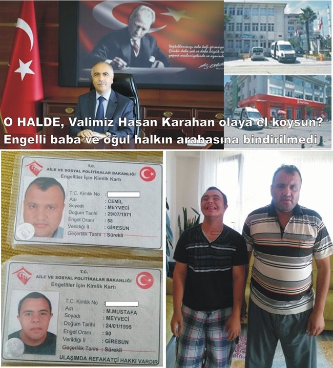 Bu konuda bulancakhaber.net’e bilgi veren ve arabaya bindirilmeyen baba Cemil Meyveci, bu durum karşısında o halde sayın valimizi göreve davet ediyorum diyerek sesini duyurmak istediği öğrenildi.