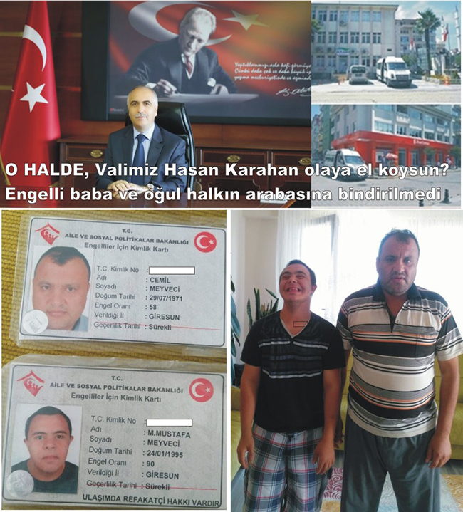 Baba Cemil Meyveci ve oğlu Muhammed Mustafa Meyveci’nin Aile ve Sosyal Politikalar Bakanlığı tarafından sürekli engelli kartı bulunduğu, ayrıca oğlunun her kim yanında olursa olsun refakatlı engelli kartından yararlanması gerektiğini söyledi. Buna rağmen Bulancak Belediyesinin aracında sürekli sorun yaşandığını belirtti. Bu durumun yetkililere defalarca bindirilmemesi ve yetkililerin hiç bir yaptırımı olmaması Baba Meyveci’yi isyan ettirdi.