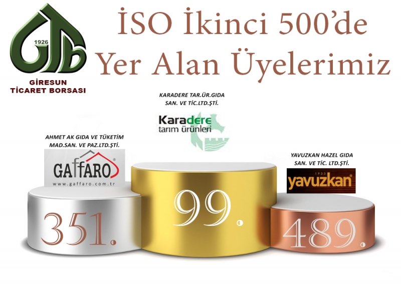 Borsamız üyesi Karadere Tarım Ürünleri Gıda San. ve Tic. Ltd. Şti. 99. , Ahmet AK Gıda ve Tüketim Mad. San. ve Paz. Ltd. Şti. 351. ve Yavuzkan Hazel Gıda San. ve Tic. Ltd. Şti 489. Sırada yerini aldı.