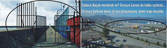 Liman sahasının çirkin ve bakımsız haliyle adeta Giresun’a yakışmayan görüntüsüne son günlerde bir de küçük mendireğe demir kapı yapılmasıyla bu çirkinliği gün yüzüne bir kez daha çıkardı. Oysa küçük mendirekte bölge halakının nefes aldığı, Şehrin ve özellikle Giresun kumyalı gençlerinin bir kültürü olan bu alana demir kapının konulmasına anlam verilemedi.