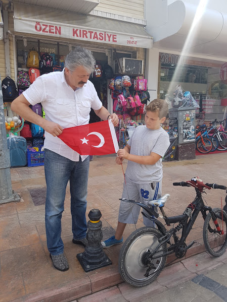 Bulancak şehir merkezinde bir kirtasiyeden bayrak alarak çok sevdiği bisikletinin arkasında ki tele heyecanla ve zevkle Türk bayrağını taktığını görülen Hakan Aydın dikkatlerimizden kaçmadı.