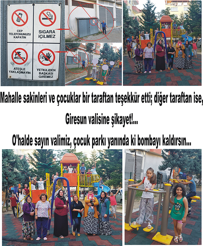 Bir taraftan yapılan güzel bir çalışma diğer taraftan ise Çocuk parkında patlamaya hazır sanayi tüplerinin iç içe olması. Sözde uyarı levhalarıyla alınan önlemler ve halazır bir yaptırımın olmaması bu kadar da olmaz dedirtti. İlla ki bir patlama mı? olması bekleniyor sesleri yükseldi.