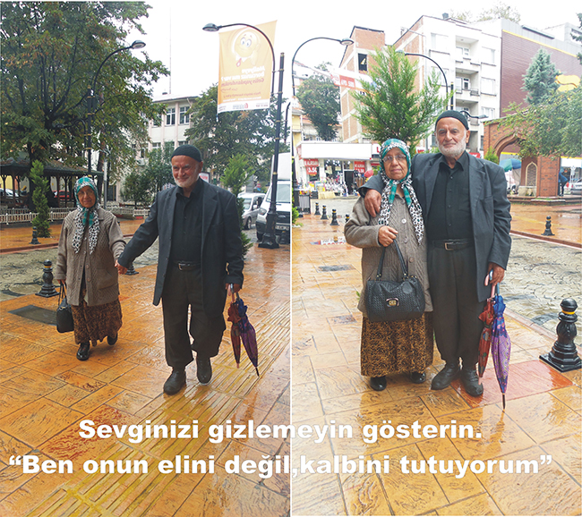 3 Oğul 7 torun sahibi 79 yaşında Selahattin ve 80 yaşında ki Tevhid Fındıkoğlu çiftti Bulancak Atatürk Caddesi üzerinde yağmurlu bir sonbahar günü bulancakhaber.net objektiflerine el ele tutuştukları görüldü. ne kadar güüzelsiniz dediğimiz de ise birbirine sarılarak biz her zaman böyle birbirimize saygılı ve sevgiliyiz cevabı verdiler. Fındıkoğlu her zaman el ele tutuşarak gezdiklerini belirterek şimdi ki gençlere örnek çift olarak görüntülendiler.