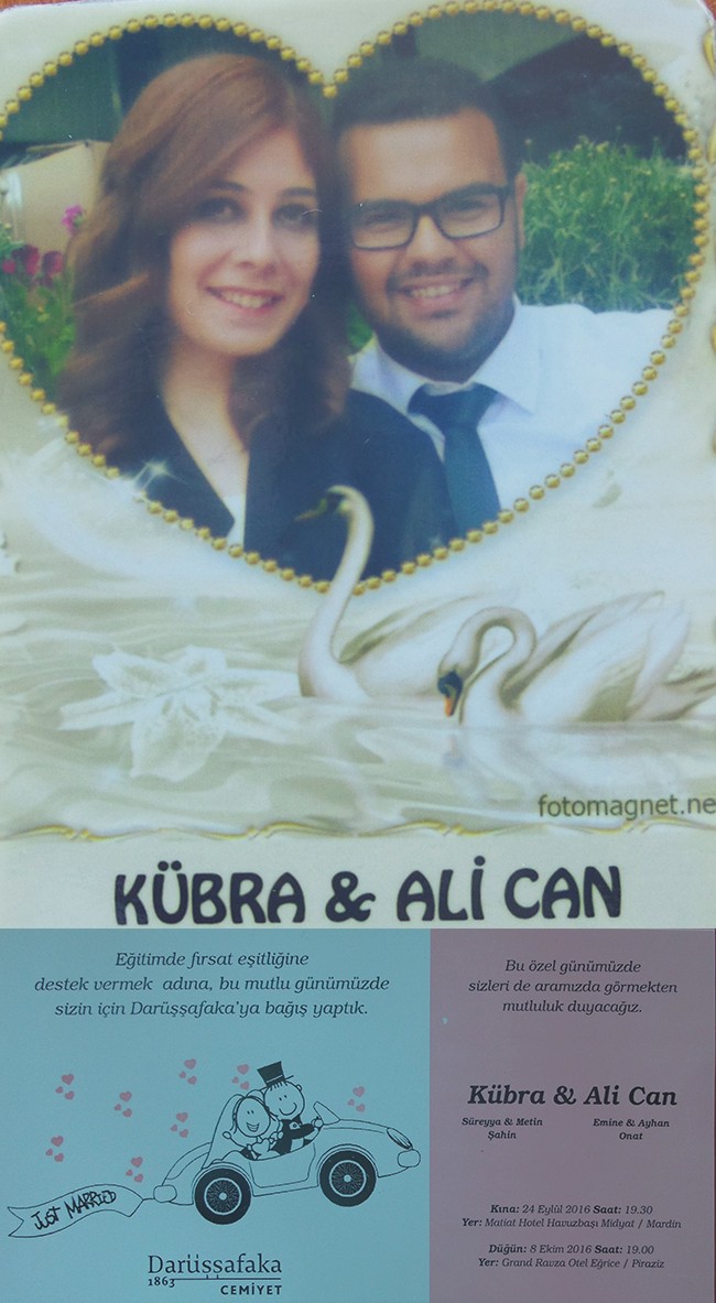 Diğer dayanışma örneği ise “Darüşşafaka Cemiyeti’nin hazırladığı düğün davetiyesi ile “babası veya annesi hayatta olmayan, maddi olanakları sınırlı, yetenekli çocukların çağdaş, Atatürk ilkelerini özümsemiş bir eğitimle; düşünen, araştıran, sorgulayan, kendine güvenen, aydın, topluma, çevresine ve ailesine karşı sorumlu, yurtsever bireyler olarak yetişmelerine olanak sağlayan ve “eğitimde fırsat eşitliği” ilkesininde olan cemiyetin davetiyeleri ile bu mutlu gününde buluşma kararı aldıkları öğrenildi.