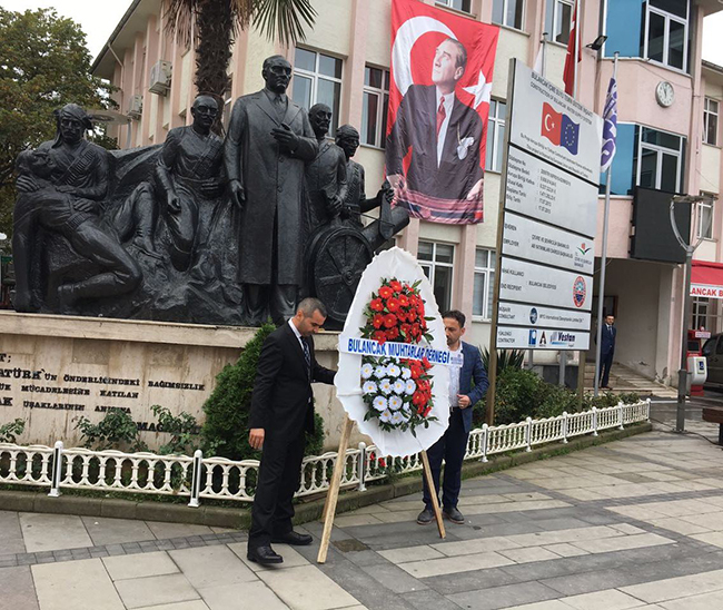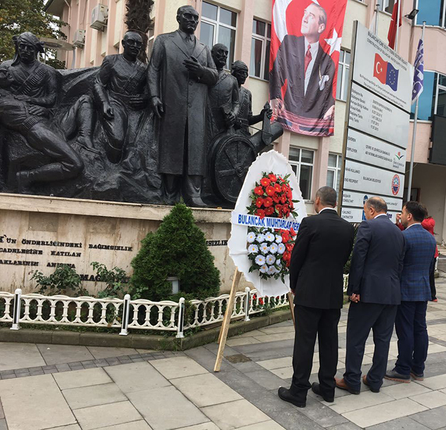 İşte bu doğrultuda Bulancak’ta ilk kez kutlanan Muhtarlar Günü Kutlaması’nda Atatürk Büstüne ilk kez konulan çelenk’i İsmetpaşa Mahalle Muhtarı İdris Şen ve Bahçelievler Mahallesi Muhtarı Olgun Gündoğdu bırakarak Muhtarlar Derneği Başkanı Turhan Elitemiz ile birlikte saygı duruşunda bulunarak ilklere ismini yazdırdıkları görüldü. Tören saygı duruşu ve İstiklal Marşı'nın okunmasıyla devam etti.