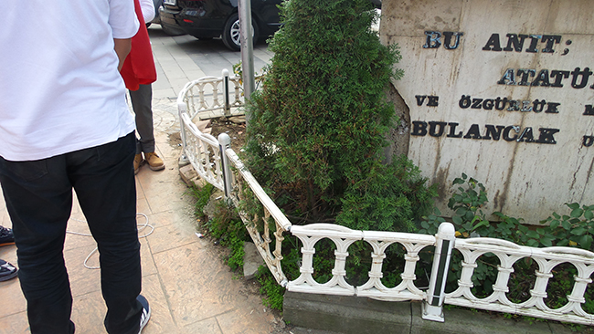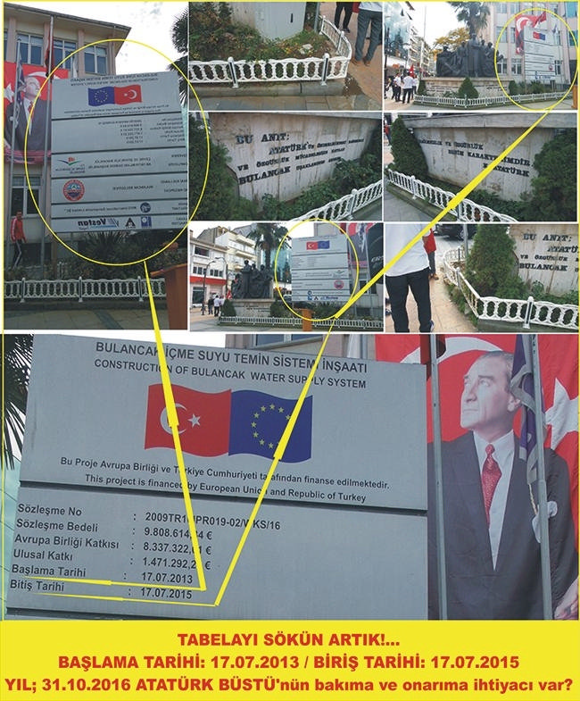 Tüm bu çalışmaların yanı sıra Bulancak Cumhuriyet Meydanı Atatürk Büstü alanına konulan ve başlama tarihi ile bitiş tarihi objektiflerimize yansıyan bu tabelanın Atatürk büstü yanından kaldırılarak çiçeklendirilmesi ve anıt cevresinin çiçeklerle süslenmesini istiyoruz.