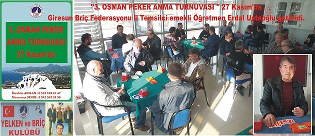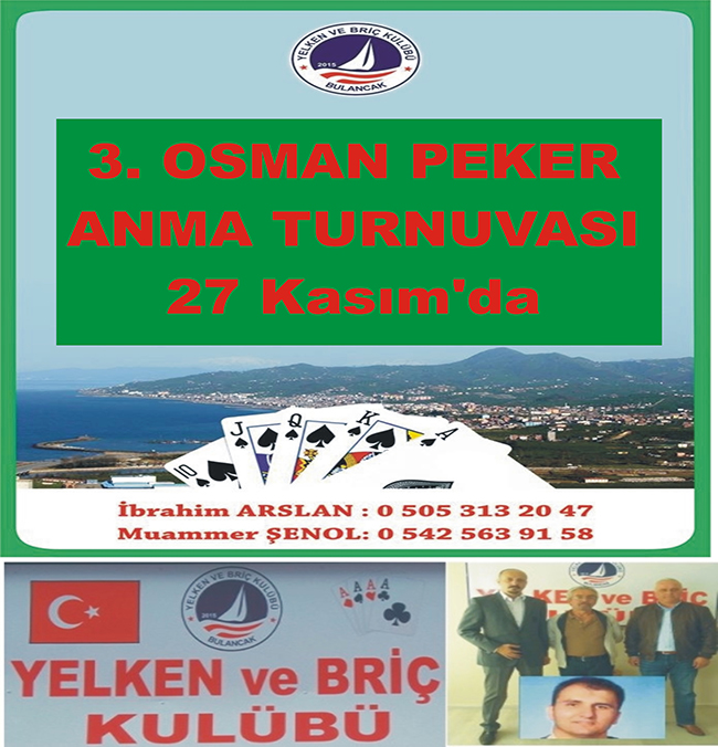 Giresun ve özellikle Bulancak’ta ilgi alanı haline gelen Kulüp 27 Kasım Pazar günü “3.Osman Peker Anma Turnuvası” ile bir organizasyon daha yapacaklar. Önceki yıllarda yitirdiğimiz Bulancak’lı mühendis ve briç’çi Osman Peker anısına, 1. ve 2. den sonra 3. düzenlenen OSMAN PEKER ANMA TURNUVASI 27 Kasım Pazar günü yapılacak.