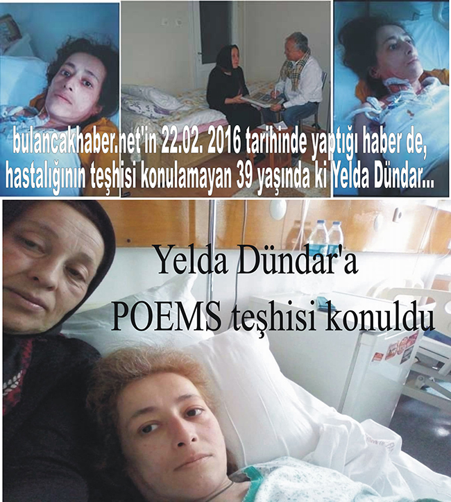 bulancakhaber.net’in 22.02. 2016 tarihinde yaptığı haber de hastalığının teşhisi konulamayan 39 yaşında ki Yelda Dündar’a POEMS teşhisi konulduğunu öğrenildi.