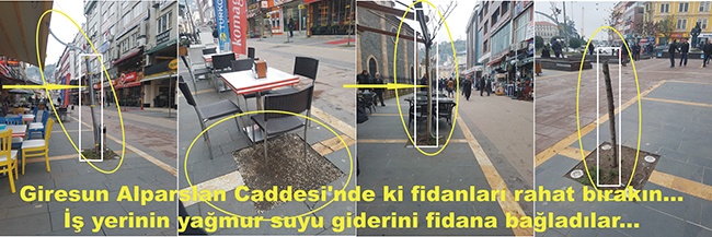 İş yerinin önündeki fidanları koruması ve kollaması gerekn iş yeri sahibi yağmur gider borusunu fidana bağlaması objektiflerimize böyle yansıdı. İş yeri sahipleri bu yanlışlıktan bir an önce dönmesi ve fidanı rahat bırakması gerekmektedir. bulancakhaber.net’in objektiflerine yansıyan bu yanlış uygulama fidanlara zarar verecektir. Kimi fidan artık fidan olmadan çıkmış sanki su giderinin dayanağı gibi görlmektedir. Ayrıca iş yeri reklam panolarının ve fidana zarar verebilecek dallarına asılan pankartların dallara zarar vermemesi için fidanları rahat bırakmaları daha doğru olacaktır. Fidanların toprağına ve üzerindeki alana masaların veya sandalyelerin denk gelecek şekilde yerleştirmeyelim.