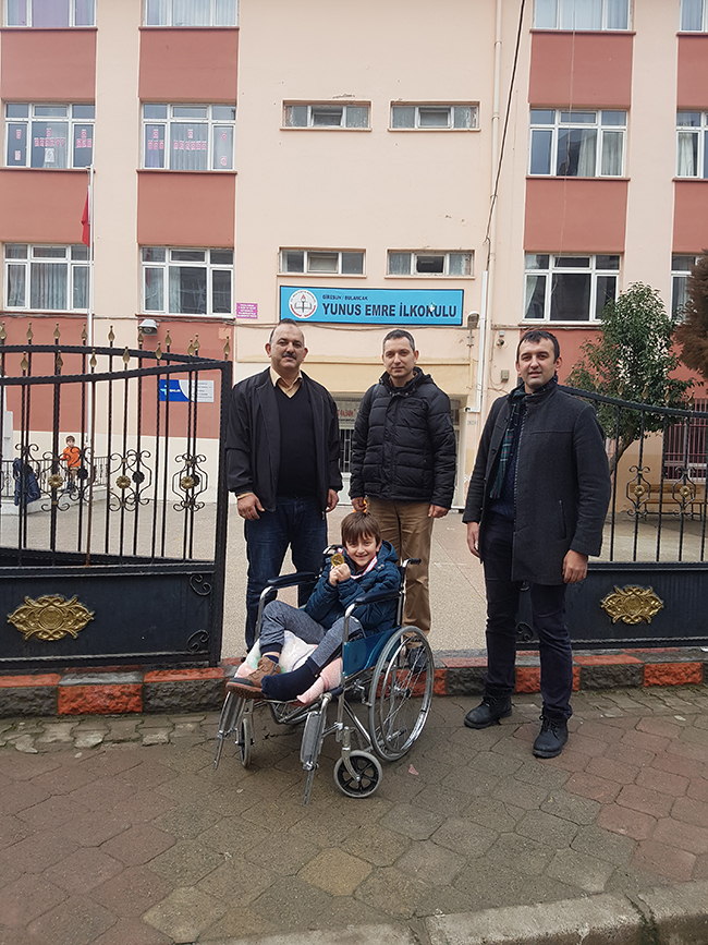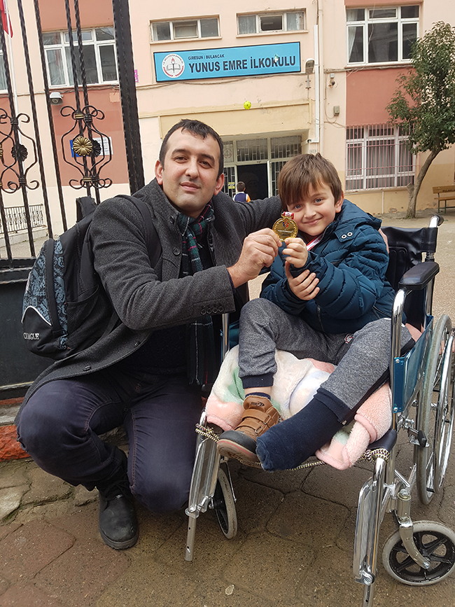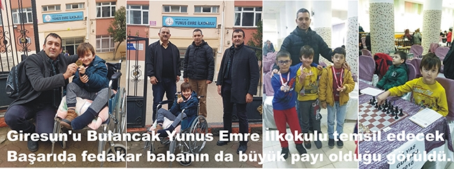 Okulumuz öğrencilerinden ve Turnuvada yaptığı 6 karşılaşmayı da kazanan yaş grubunda il birincisi Demir Küçüker’in geçen ay talihsiz bir şekilde bacağı kırılması yarışmada başarılı olmasına hiç engel olmazken fedekar babası Hasan Küçüker’de oğlunu hem okulunda hemde yarışmada yanlız bırakmayarak büyük destek olduğu öğrenildi ve objektiflerimize yansıdı. Bulancak Yunus Emre İlkokulu 2/B sınıfı öğrencisi her gün okula getiren babası Hasan Küçüker okul çıkışında Okul Müdürü Mustafa Kaya, sınıf öğretmeni Ercan Zehir ile birlikte okulun kapısında bulancakhaber.net objektiflerine yansıdılar. Yarışma öncesinde oğlunu her gün tekerlekli sandalye ile okula getiren derslerinden geri bırakmayan ve bu süreçte santranç müsabakalarına hazırlanan oğlunu her gün okula bırakıp akşam alan fedakar baba