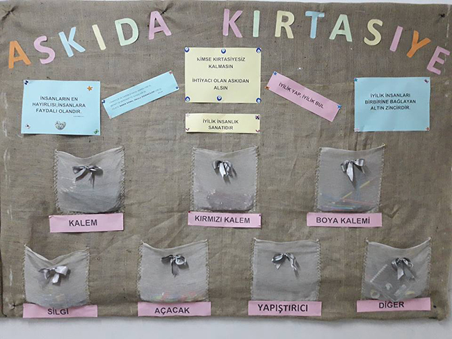 Giresun Namık Kemal ilkokulu 2/E Sınıfı öğrencileri ve Sınıf Öğretmeni Ümit Eroğlu’nun kampanya ile ilgili olarak aldıkları kırtasıye ürünlerini okul çinde hazırladıkları askıya bırakıyorlar. Böylece ihtiyac sahibi öğrencilerimiz bu askıdan ihtiyaç duydukları kırtasiye malzemelerini aldıklarını belirtti. Okul idaresi kampanyayı başlatan 2/E Sınıfı öğrencileri ve Sınıf Öğretmeni Ümit Eroğlu’yu tebrik ettiklerini söylediler.