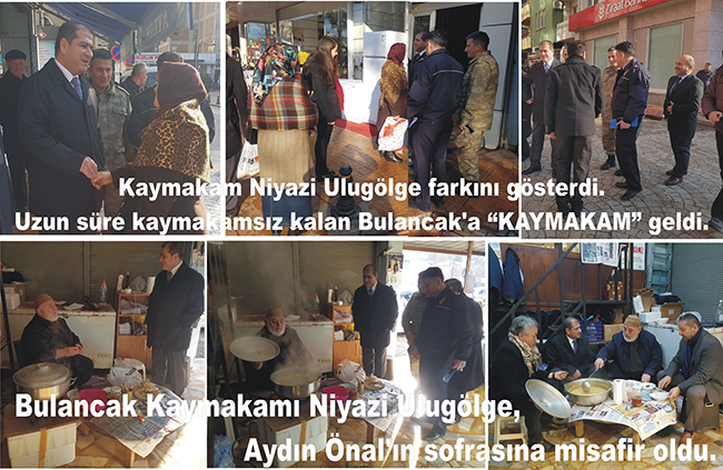 1 Aralık 2016 tarihli Resmi Gazete de yayınlanan kararname ile Bulancak Kaymakamlığı görevine atanan Niyazi Ulugölge Bulancak Kaymakamlık makamına çıktığı ve İçişleri Bakanı Süleyman Soylu'nun talimatı üzerine ilk toplantısının ötesine geçerek vatandaşla kuçaklaştı esnafın çorbasını sofrasına oturarak içtiği objektiflerimizle görüntülendi.