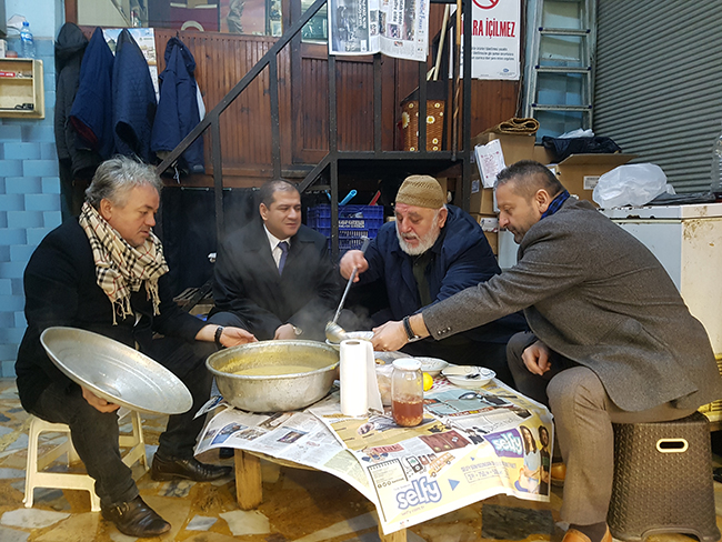 Bulancak'ın ve bölgemizin tanınmış isimlerinden Aydın Balıkçılığın sahibi Aydın Önal’ın kendi elleriyle hazırladığı ve Atatürk caddesinde kendisine hayırlı ,işler dileyen Bulancak Kaymakamı Niyazi Ulugölge’yi çorba içmeye davet etti. Kaymakam Ulugölge davete icap ederek mesai bitiminde özel olarak davet edilediği esnaf Aydın Önal’ın sofrasına misafir oldu. Aydın Onal’ın balık çorba ikramına TRT Yurt Muhabiri ve bulancakhaber.net Yayın Sahibi Mehmet Yaşar ile Bulancak Belediye Başkan Yardımcısı Orhan Güngör’de eşlik ettiği objektiflerimize yansıdı. Sıcak samini bir ortamda içilen özel yapılmış balık çorbası özel olduğu kadar bir ilk olarak ta görüntülendi. Öncesinde Bulancak halkıyla kuçaklaşan ve onları dineleyen Bulancak KaymakamI Niyazi Ulugölge daha ilk şehir gezisinde sanki kırk yıldan bu yana burada görev yapmış gibi bölge halkıyla kaynaştığı ve sorunlarını dinlediği görüldü. İlk Mahalle toplantısın da kendisinin dediği gibi “Bize gelmeyene biz gideceğiz... “ sözleri daha ilk mesai de görüntülenmesi ve objektiflerimize yansıması güzel günerin Bulancak halkını beklediğini doğruladı.
