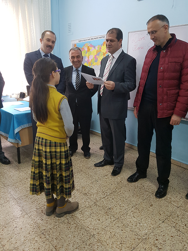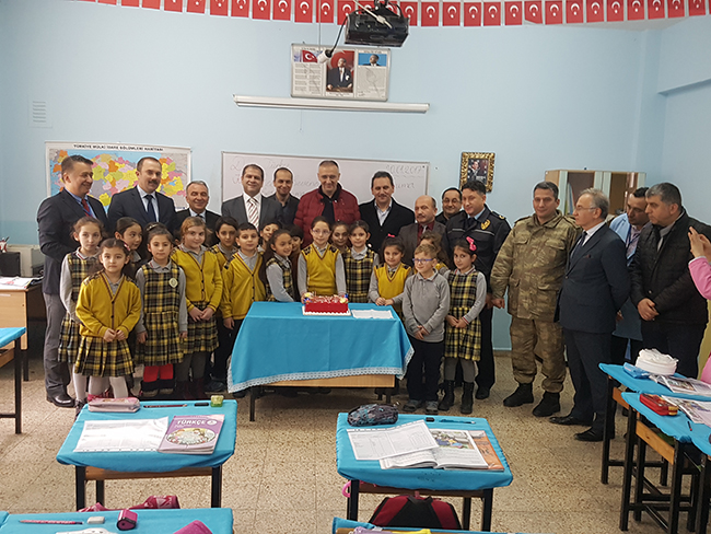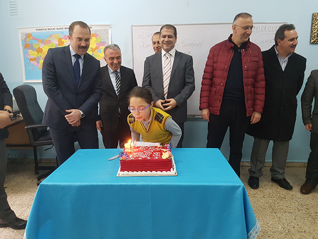 2016-2017 Eğitim ve Öğretim Yılı’nın birinci dönemi, alınan karnelerin ardından bugün sona ererken bir öğrencinin hayal edemeyeceği süpriz bir doğum günü programı hazırlanması bulancakhaber.net objektiflerine böyle yansıdı. Emriye ve Nazım Gür’ün kızları Bulancak Barbaros İlkokulu 3/F Sınıfı öğrencisi Gamze Gür’e ateş kırmızısı renginde üzerinde yaş pastası havayi fişekleri ve mumların bulunduğu “HEM KARNEMİ HEM YENİ YAŞIMI ALDIN MUTLU YILLAR GAMZE” yazılı pasta hayallerinin üzerinde bir yaş günü kutlaması olduğu görüldü. Bulancak Kaymakamı Niyazi Ulugölge sınıfta en son Gamze Gür’ü karnesi almaya çağırıldığında ona süpriz bir şekilde karne sonrası yaşpastasının ortaya gelmesiyle bir anda şaşkınlık ve heyecan yaşayan Gamze Gür bir süre şaşkınlık ve özel olanma hissi ile konuşamadığı görüldü. bulancakhaber.net’inde tanık olduğu ve ilk defa karne dağıtımında bir mülki amirin talimati ile bir öğrencinin karne günü hayallerinin ötesinde yaş günü kutlaması hazırlatması 8 yaşında ki Gamze Gür unutamayacağı bir yaş günü yaşattı. Öte yandan Gamze Gür’ün sınıf arkadaşlarına da Kaymakam Niyazi Ulugölge tatilde okumaları için Kitap hediye ettiği ve tüm sınıfın gönlünü kazandığı görüldü. ayrıca program sonrasın da herkez dağıldıktan sonra yaş günü kutlanan Gamze Gür’ün kendisini tutamayarak sevinçten ağladığı kendisini çok özel ve mutlu olduğunu söylediği öğrenildi. İlk programında sınıfta öğrencilerle birlikte kısa bir sohbet yapan Bulancak Kaymakamı Ulugölge “bugün Gamze kızımızın doğum günü. Hem sınıf arkadaşları, hem öğretmenleri, hem de Milli Eğitim Müdürlüğümüz çocuklarımızın kıymeti yüksek olduğu için, onlara değer verdiğimizi göstermek için bizde böylesi bir karne dağıtımı yapmak istedik. Bulancak Mülki amirleri ve Müdürlerimiz ile birlikte Gamze kızımızın doğum gününü kutlamaya geldik. Onun sayesinde burada pasta yedik. Kendisine sağlıklı, huzurlu, başarılı, uzun bir ömür diliyorum. Gamze Gür kızımızın sınıfının başarılı öğrencilerinden biri olduğunu dolayısıyla hem kendi adına hem de insanlık adına Türkiye için çok güzel şeyler yapacağını, gelecekte çok büyük işler başaracağına inanıyoruz. Tekrar doğum gününü kutluyoruz” dediği öğrenildi. Kaymakam ve beraberindekiler daha sonra çocuklarla birlikte yaş günü pastası yediler günün hatırası olarak objektiflerimizin karşısına geçtiler. Daha sonra Kaymakam ve mülki amirler diğer sınıfları da ziyaret ettileri ve okuldan ayrıldıkları belirtildi.