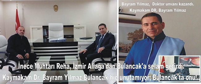 Antalya Akdeniz Üniversinde 4 yıldır “Kurumsal İletişim ve Kurum Kültürü" konusunda yürüttüğü doktora çalışmalarını tamamlayan eski Bulancak kaymakamı yeni İzmir Aliağa Kaymakamı Dr. Bayram Yılmaz’ı Bulancak İnece Köyü Muhtarı makamında ziyaret etti.