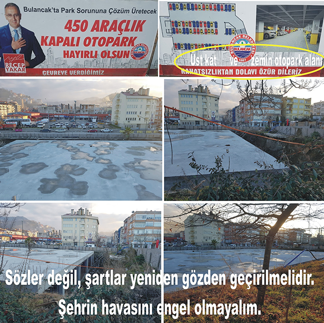 Sahilde ki yeni yapılanmanın ve yüksek katlı binaların şehrin havasını değiştireceği gibi dokusunu da değiştireceği açıkça görülmektedir. Bu nedenle mevcut iki yol arasında kalacak olan bölgelere kesinlikle iki yolun kot seviyesi alınarak çalışma yapılmalıdır. İşte bu nedenle Bulancak sorunu olan otoparkın ilk çalışması olan otogar ve Bulancak eski İlçe Emniyet Müdürlüğü’nün karşısındaki otoparkın zemin ve şu anda ki üst katıyla tamamlanması gerekmektedir. Şayet bir üst kat daha çıkarsanız Bulancak’a en büyük ihaneti projeyi yapan yetkililer ve buna göz yuman Mülki amir ve bölge halkı olacaktır. Nasıl ki Bulancak iskelesini yıkılırken seyrettik. Şimdi de bu yapılan yanlışlığa ses çıkarmayarak ikinci bir yanlışlığın parçası olmak istemiyoruz. Bununla birlikte Bulancak genelinde ilk önce yapılacak olan çalışma ilçe girişi ve Karadeniz çift yol içinde tek kavşak bulunan Bulancak iskele mevkiinde ki şehir içi girişi olan Atatürk Caddesi’nin eskisi gibi şehir içine giriş ve çıkış olarak yeniden düzenlenmelidir. Şu anda yapılan otogar ve Bulanak eski İlçe Emniyet Müdürlüğü’nün karşısındaki otopark bu haliyle düzenlenmelidir. Fotograf karesindeki gibi bu haliyle zemin ve üst kat olarak bölge halkının kullanımına sunulmalıdır. Kültür Sitesi olarak yapılan alanın haftanın bir günü Salı pazarı diğer günleri de otopark olarak Bulancak ve Bölge halkının kullanımına kazandırılmalıdır.