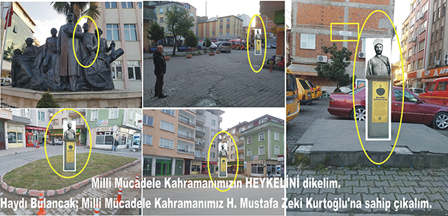 Milli Mücadelenin Gönüllü Alaylarının imamı Kurtoğlu Mustafa Zeki Hoca Belgesel çekimlerine Küçüklü Köyünde başlandığı ve tarihsel bir belgesel yapıldığı, Birinci Dünya Savaşı ve Kurtuluş savaşının önemli simalarından Giresun gönüllü alaylarının imamı Kurtoğlu Mustafa Zeki Hoca’nın Bulancak Fatih Caddesi girişinde ki yeni yapılan kavşak alanının yeşil alanına heykelinin yapılmasını istiyoruz. bulancakhaber.net Genel Yayın Yönetmeni Mehmet Yaşar’ın projelendirdiği her sene anma törenlerinin kabri başında ki programından sonra devam ettiği H. Mustafa Zeki Kurtoğlu meydanı girişine Milli Mücadele kahramanımızın heykelinin dikilmesini istiyoruz. Bir rivayete göre Bulancak Cumhuriyet Meydanı Atatürk heykelinin hemen yanında kuran tutan kişinin de Milli Mücadele Kahramanımız H. Mustafa Zeki Kurtoğlu olduğu söylenirken mevcut şu anda ki sözde anıt yapılan ne olduğu anlaşılamayan anıtın kaldırılması ve kahramanımıza yakışır bir anıt yapılması görlmektedir. Ayrıca yeni yapılan Fatih Caddesi ile Şehit Üstteğmen Oğuz Türüdü Caddesi’nin birleştiği noktada ki yeşil alana da Milli Mücadele kahramanımızın HEYKELİ’ni dikilmesi, adına yakışır meydana girişinin ve meydanda ki anıtın yeniden Milli Mücadele Kahramanımıza yakışır bir Meydan yapılmasını istiyoruz.