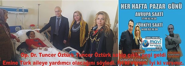 Neşe’yi Prof. Dr. A.İlhan Özdemir Devlet Hastanesi yatışını yaparak bir nemse olsun ağrılarını dindirmek ve tedavisi için çalışma başlatan Başhekim Genel Cerrahi Uzmanı Op. Dr. Tuncer Öztürk’ün güzel insanlar tarafından Neşe’ye yardımcı olacaklarını öğrendik. Bunlardan bir tanesi Emine Türk oldu. Emine Türk yardımcı olmanın ötesinde ayrıca Neşe’yi tanıtmak adına “her hafta Pazar Günü Avrupa Saati canlı yayını ile Mavi Karadeniz’de Kenan Yılmaz, Güngör Çoşkun ve Emine Türk’ün canlı yayınında yer vereceğini ve elinden gelen yardımı yapacağını öğrenmiş bulunuyoruz. Bu mutluluğu paylaşmak adına Prof. Dr. A.İlhan Özdemir Devlet Hastanesi Başhekimi Genel Cerrahi Uzmanı Op. Dr. Tuncer Öztürk’ü ve Neşe’yi ziyaret eden Mehmet yaşar bu güzel ve heyecan verici gelişmeyi okuyucularıyla paylaşmak ve mutluluğun ve sevincin paylaşarak çoğalmasını istedi.