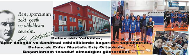 bulancakhaber.net Ulu Önder Mustafa Kemal Atatürk’ün sözlerinin arasında sporcu ne kadar iyi olursa olsun en başta güzel ahlaklı olması gerektiği, Beden ve vücudunun hızlı ve sağlıklı olmasından çok etrafındaki insanlara karşı davranışları bakışını belirten anlayış içinde olan Bulancak Züfer Mustafa Eriş Ortaokulu’nu yürekten kutluyoruz. Başarılarınızın devamını diliyoruz. Yetkililerin bu başarınızı görerek sizleri onurlandırmasını diliyoruz.