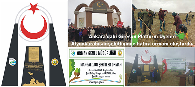 Ankara'da her kademedeki Bürokrat ve hemşehrilerimizin gönüllü katılımıyla oluşturulan Ahmet Temur tarafından organize edilen, Giresun Platformu üyeleri aylık yemekli toplantılarının yanı sıra kalıcı bir eser bırakmak maksadıyla çok sayıda Giresunlu Şehidin bulunduğu Afyonkarahisar şehitliğinde hatıra ormanı oluşturdular.
