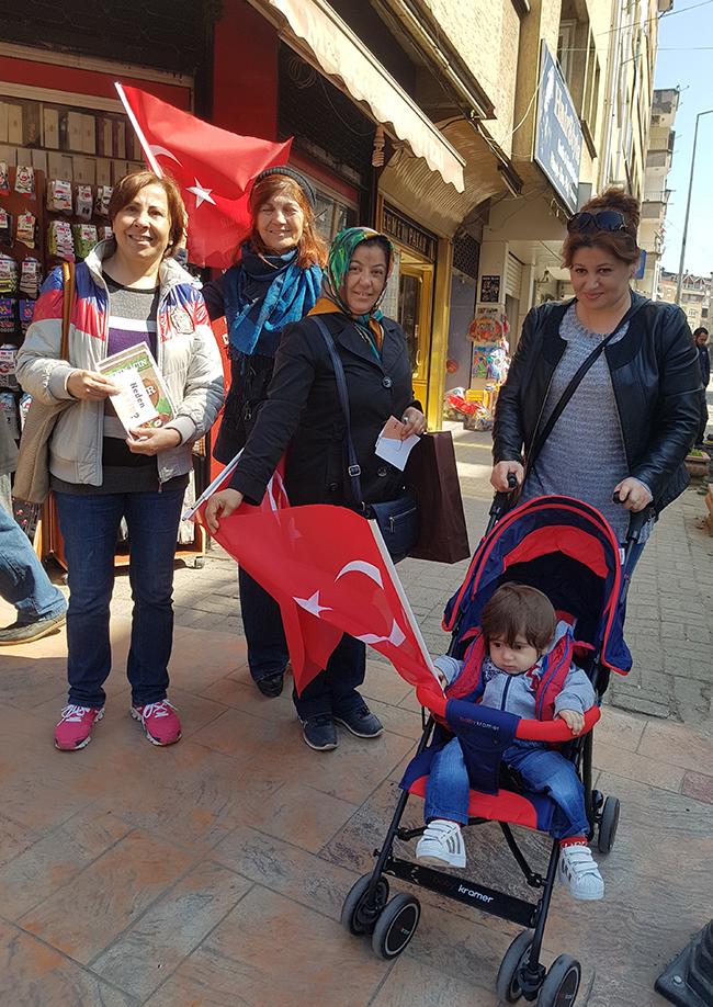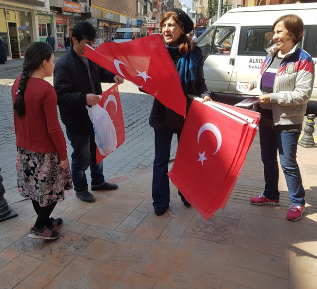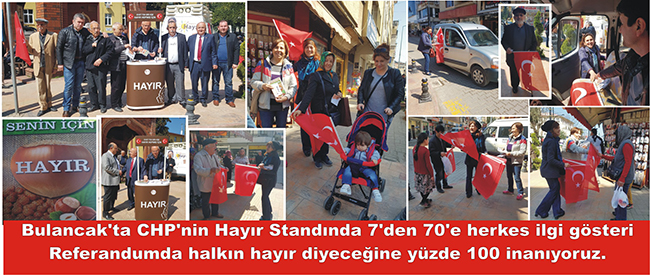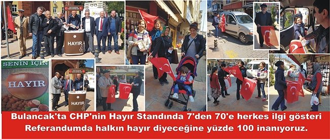 CHP lideri Kılıçdaroğlu, AKP’nin rejim değişikliğini halka kabul ettirmek için CHP’yi farklı bir pozisyonda göstermeye çalıştığı, bu tuzağa düşmeyecekleri belirtiği açıklamada “Referandum sırasında kullanacağımız tek bayrak Türk Bayrağı olacak” açıklaması doğrultusunda Bulancak’ta Hayır standında Türk Bayrağı dağıtımı bulancakhaber.net’ın objektiflerine böyle yansıdı.7’den 70’e her kesime sunulan Türk Bayrağına gösterilen ilginin yoğun olması ve eline Türk Bayrağı alan herkesin çocuk sevinci içinde olduğu objektiflerimize böyle yansıdı. Bulancak CHP’nin büyük bir heyecanla Demokrasiye inanan, güçlü bir parlamenter sisteme inanan, kimlik, siyasi görüş, yaşam tarzı itibariyle ne olursa olsun demokrasiyi savunan herkesin ortak mücadelesi olacağını gösterdiler. Bu mücadeleyi yaparken de toplumun her kesimini kucaklamaya özen gösteren Bulancak CHP Hayır standında tek bayrak Türk bayrağını dalgalandırdılar.