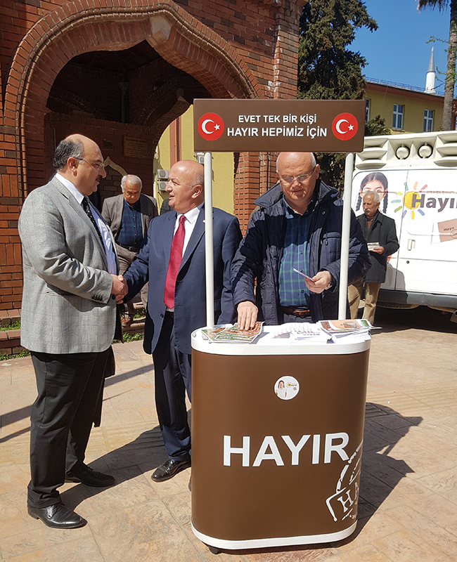 Bulancak CHP ilçe Başkanı Reşat Nuri Özdemir bulancakhaber.net Genel Yayın Yönetmeni Mehmet Yaşar’ı Hayır standına davet etti. Yapılan çalışmada Yaşar’a açıklamalarda bulunan CHP İlçe Başkanı Reşat Nuri Özdemir şu açıklamalarda bulundu. CHP İlçe Başkanı Özdemir, “ister muhafazakâr, liberal, ülkücü, Atatürkçü olsun, kim demokrasiyi savunuyorsa bu anayasa değişikliğine hayır demelidir. Referandumda halkın hayır diyeceğine yüzde 100 inanıyoruz. Sizin de gördüğünüz gibi Hayır Standında 7’den 70’e herkesim ilgi gösteriyor. Buda bizleri oldukça memnun ve mutlu ediyor” dedi.