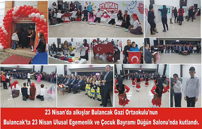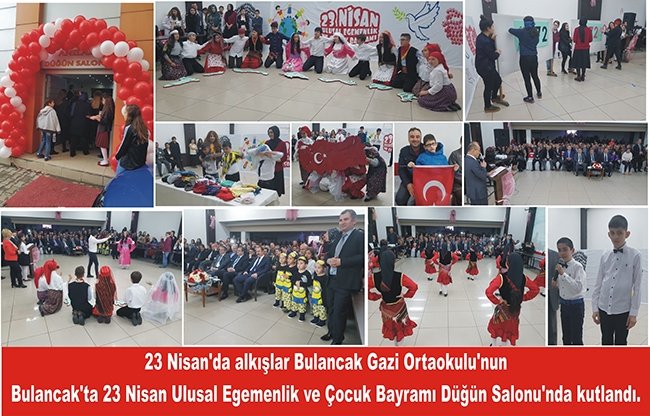 Bulancak Anılar Düğün Salonu’nda yapılan program saygı duruşu ve İstiklal Marşı okunmasıyla başladı. 23 Nisan Ulusal Egemenlik ve Çocuk Bayramı kutlamalarına Bulancak Kaymakamı Niyazi Ulugölge, Bulancak İlçe Milli Eğitim Müdürü şenel Bulut, Bulancak Belediye Başkan Yardımcısı Orhan Güngör ve daire müdürleri ile mülki amirlerin katıldığı görüldü. Anılar Düğün Salonu’nda yapılan ilçe programına adeta Gazı Orta Okulunun öğrenci velilerini dahi alamayacak bir salonda 23 Nisan Ulusal Egemenlik ve Çocuk Bayramı kutlamaları sona erdi.