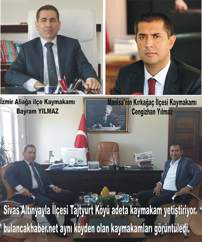 Ulu Önder Mustafa kemal Atatürk’ün sözlerini ilke alan bu iki güzel insan bu iki güzel kaymakam ailelerinin ve memleketimizin gurur tabloları olmuşlardır. İzmir Aliağa ve Manisa Kırkağaç ilçelerini Sivas Altınyayla İlçesi Tahtyurt Köyü’nden Bayram Yılmaz ve Cengizhan Yılmaz kaymakam olarak görev yapıyorlar. İzmir Aliağa İlçe Kaymakamı Bayram Yılmaz ve Manisa'nın Kırkağaç İlçesi Kaymakamı Cengizhan Yılmaz aynı köyden olup her ikisinin de kaymakam olması Sivas ve doğup büyüdüğü il ilçe ve köyünde önce ailelerinde daha sonra köy halkına büyük gurur yaşattığı öğrenildi. Geçen günlerde aynı köylü olan Kaymakam Yılmazlar sosyal alanda paylaşımlarını ve yaşamları başarılarla dolu olması sebebiyle bulancakhaber.net olarak bizlerde paylaşmak istedik. Bulancak’ta daha önce ki yıllarda kaymakamlık yapması ve burada güzel çalışmalarda bulunması sebebiyle ele aldığımız bu güzel gerçek hayat hikayesi bizleri de gururlandırdı. Bulancak’ta son dönemlerin de yaptığı ve hafızalarda kalan “Şarapçı Recep” olarak tanınan insanın ailesi ile son geceyi tertemiz mis kokulu annesinin yanında geçirmesini sağlayan Bayram Yılmaz’ı anmak istedik. Şarapçı Recep soğukta kış gecelerinde dışarılarda yatmanın ağırlığı ile onu alıp ailesi ile barıştırması temizleyip tertemiz ailesine teslim etmesi akıllara geldi. Yıllar sonra ailesi ile son gecesini bilmeden ailesi ile geçiren ve o gece yatağına yatan fakat bir daha uyanamayan Recep kardeşimi rahmetle anıyor bizlere hatırlattığı içinde kendisine teşekkür ediyoruz. Bu sebeptendir ki Bayram Yılmaz Bulancak halkı için çok önemli ve değerli olduğunu bir kez daha hatırlatmak istedik. Sosyal alanda gördüğümüz bu güzel birlikteliği ve kendilerinin söylediği gibi köylüm kardeşim diyerek birbirlerine hitap eden Yılmaz Kaymakamlar memleketi Sivas Şarkışla ilçesi ve köy sohbeti yapmanın mutluluğunu ve huzurunu yaşadıkları görüldü.
