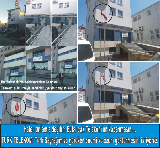Ülkenin en köklü ve yaygın iletişim operatörü olan Türk Telekom Giresun Bulancak bayisi neden kapandığına dair hiçbir açıklama yapılmıyor. Üstüne üstelik Bulancak Telekom binası kendisine ait olduğu halde kapatılıyor. Çok basit olarak bölge halkı yetkililerin beceriksiz ve sahipsiz olduğu için kapatıldığını belirtmelerine rağmen. 07.12.2016 tarihinde bulancakhaber.net’in yaptığı haberden bu yana terk edilen Bulancak Telekom binasının önünde ki dalgalanan Türk Bayrağımız sahipsizliğimizin açıkça örneği olarak yüzümüze tokat gibi çarpıyor. Madem kendinize ait binayı kapatarak Bulancak halkını sahipsiz bıraktınız onu anladık ama uğruna şehitler verdiğimiz bayrağımıza yapmış olduğunu bu sahipsizliği kabul etmiyoruz. Her gün görsel ve yazılı medya aracılı ile ataklarını ve yeniliklerini açıklayan Türk Telekom Bulancak’ta kendisine ait binasını ve işletmesini neden kapattığı halen soru işareti taşırken binanın önünde ki Türk bayrağımızın al rengi solmuş yıpranmış olmasına rağmen nazlı nazlı dalgalanması içimizi açıktı. Bulancak ilçesinin sahipsizliğini ve idare boşluğunu açıkça ortaya koyan ama nazlı nazlı dalgalanan bu Türk bayrağımızın yenilenmesini kapalı olan kapının da ardına kadar açılarak hizmet vermesini istiyoruz. Bulancak genel olarak sahipsizliğine bir de bana ne eklenince kaçınılmaz son kaderimiz oluyor. O kadar sahipsizsiz ki, Türk Telekom kendi ismiyle açılan bayilere tam yetki vermemesi ilçe halkını Giresun Telekom’a gitmesini mecbur kılması açıkça Bulancak halkına ceza vermekten başka hiçbir şey olamaz olarak nitelendirildi.