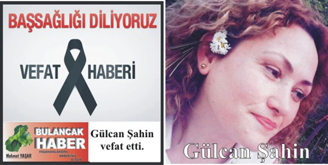 Basın camiasının değerli ve güzel ismi arkadaşımız Gülcan Şahin’i kaybetmenin üzüntüsü içinde kaldık. Mavi Karadeniz TV’nin Giresun reklam sorumlusu Gülcan Şahin’in vefatı büyük üzüntü yaşattı. Şahin, uzun suredir tedavi gördüğü hastalığına yenik düştü. bulancakhaber.net Fahri Şahin, Ercan Şahin başta olmak üzere Şahin ailesinin ve basın camiamızın başı sağlığı dileriz. Allah'tan rahmet cennet mekan diler geride kalan ailesine ve sevenlerine sabır metanetler dileriz.