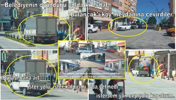 Bırakın yan cep alanını esnaf malzemesini yolun ortasında aracı tutarak boşaltıyor. Birde bunun haricinde yan cep yola demir el arabası veya dubalarla kapatarak amacı dışında kimseye kullandırmaması bu gücü nerden alıyor dedirtti. Yanı sizin anlayacağınız burası bana ait ister yolu kapatırım istersem yan cep yolu kapatırım diyerek kraldan çok kral oluyorlar. Tüm bunlar yaşanırken Bulancak Belediyesi, Bulancak emniyet Müdürlüğü sadece seyirci kalıyor. Bu ne düşüncesizlik benden başka kimse buraları kullanamaz düşüncesinde olanlar Bulancak ilçesini köye çevirdiler. Şehir içine terk edilen E-5 yolunda özellikle oto galericilerin kullanıldığı yan yollar oto galericiler tarafından hoyratça kullanılırken, birde sahilde ki kargo işletmeleri aynı şekilde bölge halkını düşünmeden iş yerlerinin önünü köy meydanı gibi kullanması sahipsizliğimizi ve şehir de yaşam kültürünü bilmediğimizi açıkça ortaya çıkartmıştır.