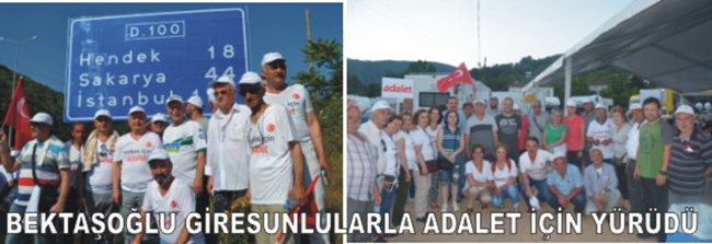Başından beri yürüyüşünün değişik etaplarında bulunan CHP Giresun Milletvekili Bülent Bektaşoğlu da, Giresun’dan gelen partililerle birlikte 17 kilometre yol katederek Sakarya’nın Hendek ilçesi girişinde yer alan konaklama alanına ulaştı. “YÜRÜMEK BİZİM TARİHİMİZDE VAR” Yürüyüşle ilgili değerlendirmede bulunan Bektaşoğlu, şunları söyledi: “32 derce sıcak altında gerçekleşen yürüyüşümüze, Karadeniz’den, Giresun’dan gelen hemşerilerimizde bizlere katılarak, güç ve destek verdiler. Onlarla 15 bin kişiye ulaştık.