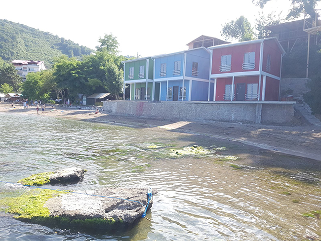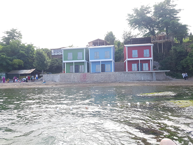 Piraziz sınırları içinde Eğrice mevkiinde çadırlara istinaden daha güzel ve sevkle yapılmış olan YEŞİL-MAVİ ve BORDO renklerinde ki evler her ne kadar prefabrik yapılsa da buna ancak YALI EVLERİ denir dedirten üç evin kime ait olduğu merak uyandırmaya devam ediyor. Bu kadar sevkli ve özel olarak adeta denizin içine yapılan bu evlerin sadece önünde verandasının çok kısa olduğu ve denize uzanan iskelesinin neden yapılmadığı tek olumsuzluk olarak dile getirildi. Oysa hemen önünde deniz içinde ki kayalar iskele yapmaya çok müsaitken. bulancakhaber.net hafta sonu gittiği halk plajında kime sorsak bilmediği yeşil mavi ve borda renkte ki prefabrik yapılar iki katlı olup adeta Karadeniz’in içine yapılmışçasına görkemli bir şekilde objektiflerimize yansıdı. Her ne kadar mavi ve yeşil simetri dururken bordonun biraz ayrılmış olması simetriyi bossa da yandan bakıldığında aynı sırada durması göze güzel görüldü.