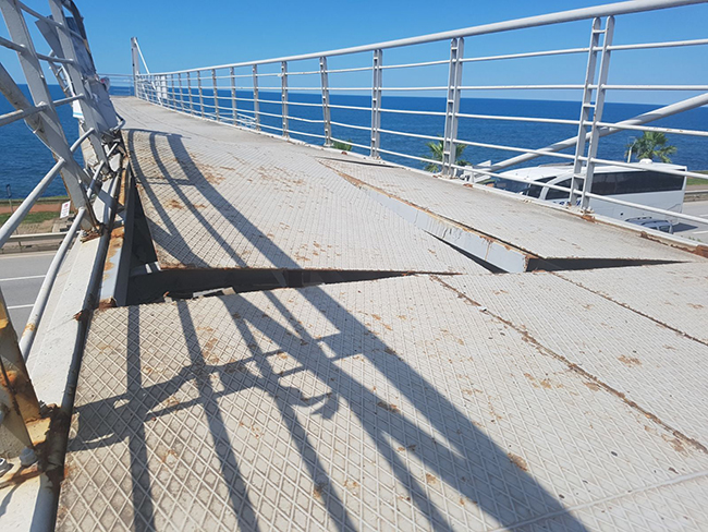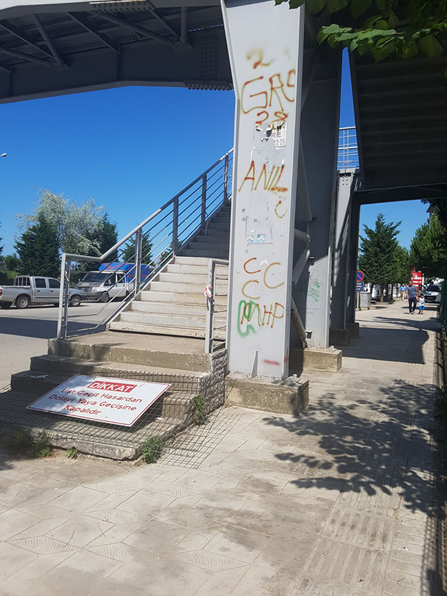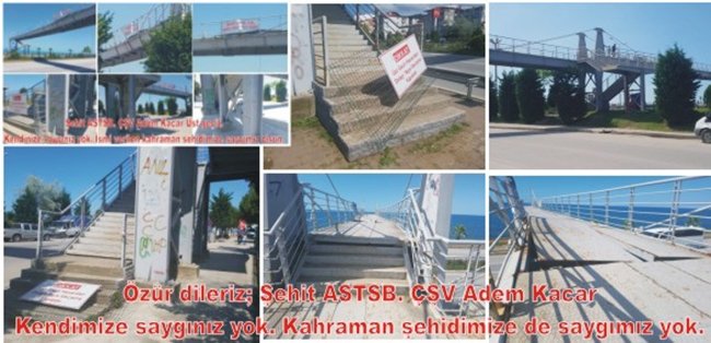 bulancakhaber.net kazadan bu yana üst geçitte hiçbir çalışma olmaması ve vatanı uğruna şehit olan üst geçide adı verilen ASTSB. ÇŞV Adem Kacar’dan özür dileriz. Yapılan saygısızlık Kendimize saygınız yok, Kahraman şehidimize bari saygımız olsun dedirtti. bulancakhaber.net olarak geçen gün fotoğrafını çektiğimiz ve bölge halkının tehlikeli olmasına rağmen üst geçidi kullanması ve kapalı olan giriş veya çıkışı açarak kullanması sonucunda yaşanacak bir olumsuzlukta kim sorumlu olacak dedirtti. Üst geçitte oluşan hasar ilk günkü gibi dururken üst geçidin ortasında ki dört basamaklı merdiven bu ilçede engelli vatandaşların bu merdiveni nasıl geçeceği merak konusu oldu. öte yandan hasarlı ve tehlikeli olduğu içn kapatılan üst geçitten insanların geçtiği görüldü.