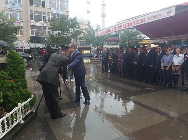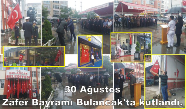 Tüm yurt genelinde olduğu gibi Giresun Bulancak’ta da 30 Ağustos Zafer Bayramı kutlamaları kapsamında ilk olarak Bulancak Cumhuriyet Meydanı’nın da ki Atatürk Anıtı önüne kaymakam Niyazi Ulugölge’nin çelenk bırakmasıyla başladı. Daha sonra saygı duruşu ve istiklal Marşımız okundu. Hemen ardından Bulancak Kaptan Ahmet Fatoğlu Mesleki ve teknik Anadolu Lisesi öğrencisi Kerim Yıldız “ Bayrak” adlı şiiri okundu. 30 Ağustos Zafer Bayramı'nın 95’inci yıldönümü nedeniyle günün anlam ve önemini belirten konuşmaları yapmak üzere kürsüye Bulancak İlçe Jandarma Komutanlığı Personeli Jandarma Kıdemli Başçavuş Mustafa Çakır bir konuşma yaptı. Törene Bulancak Mülki amirleri, daire müdürleri, siyasi parti Başkanları katıldılar. Programa vatandaşın yağmur dolayısıyla meydan çevresinde katıldığı görüldü. Öte yandan her ne kadar meydan bayraklarla donatılmasa da Bulancak esnafı iş yerlerinin önüne Türk Bayraklarını asması bulancakhaber.net objektiflerine böyle yansıdı.