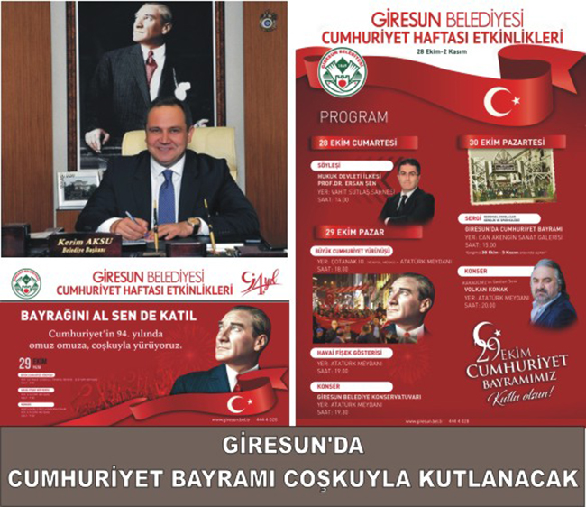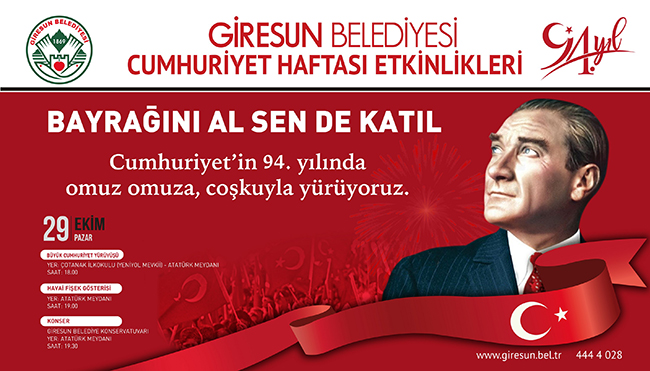 Cumhuriyet’in kuruluşunun 94.Yılını büyük bir heyecan ve coşkuyla kutlamaya hazırlanan Giresun Belediyesi, 3 gün boyunca bir birinden çeşitli etkinlikler ile Cumhuriyet coşkusunu yaşatacak.