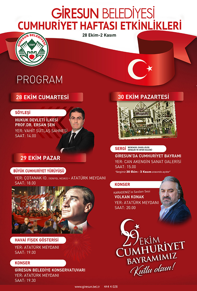 Giresun Belediyesi tarafından hazırlanan 29 Ekim Cumhuriyet Bayramı kutlama etkinlikleri programı belli oldu.