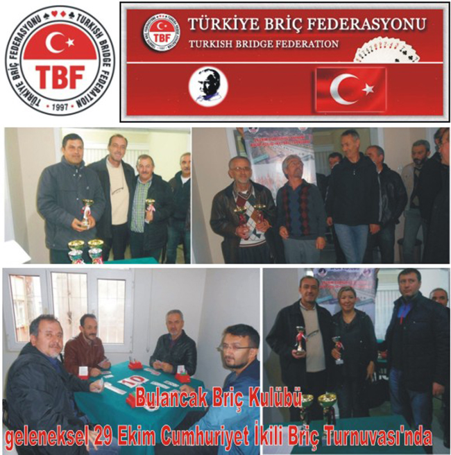 Her sene 29 Ekim’de düzenlenen “Cumhuriyet ikili briç turnuvası” bu sene İbrahim Arslan, Muammer Şenol, Erol Kara ve Semih Beşikçi ile düzenlenecek olan ikili briç turnuvasına katılacağı öğrenildi. Türkiye genelinde birçok il ve ilçeden Briç sporcularının katılacağı 29 Ekim Cumhuriyet İkili Briç Turnuvası’nda Bulancak Briç Kulübü’nün derece yaparak ilçeye döneceği bekleniyor. Cumhuriyet’in kuruluşunun 94.Yılını’nın kutlanacağı program arasında Briç Federasyonu Başkanı Nafiz Zorlu bizzat katılacağı ve tüm briç sporcuları ile birlikte 29 Ekim Pazar günü turnuva öncesinde Ulu Önder Mustafa Kemal Atatürk’ün Anıtkabir'de mozolesini ziyaret edecekleri öğrenildi. Cumhuriyetimizin kuruluşunun 94 yıldönümünde Ankara Arena Spor Salonu’nda ikili briç turnuvasının oldukça heyecanlı ve bir o kadar da güzel geçeceği vurgulandı. Bulancak Briç Spor Kulübü’nden katılacak olan İbrahim Arslan, Muammer Şenol, Erol Kara ve Semih Beşikçi Birleştirici ve kaynaştırıcı bir özelliği bulunan Briç müsabakasına katılacak olmanın heyecanı içinde oldukları öğrenildi.