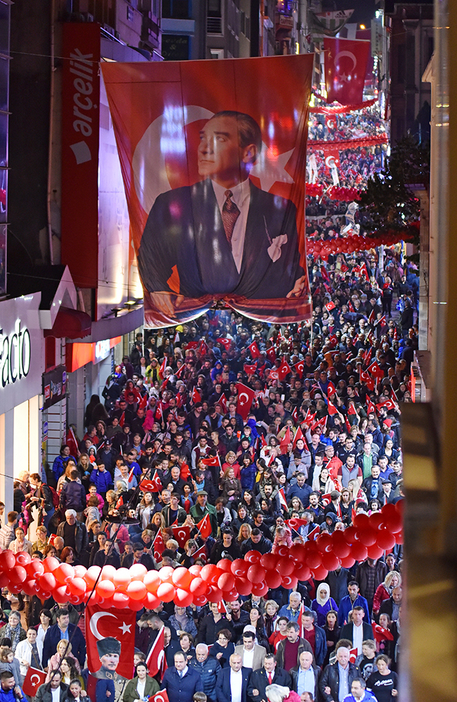 Yeniyol Çotanak İlkokulu önünde toplanan her yaştan coşkulu kalabalık, Belediye Bandosu ve Fener Alayı eşliğinde Belediye Başkanı Kerim Aksu’nun katılımı ile yürüyüşe geçti. İzmir Marşı eşliğinde Gazi Caddesi üzerine gelen gurup Atatürk Meydanı’nda yaklaşık 20 binin üzerine ulaştı. Her yaştan vatandaşın katıldığı Büyük Cumhuriyet Yürüyüşü, Cumhuriyet’e olan bağlılığı bir kez daha göstermiş oldu.