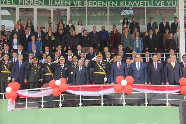 Program, Vali Sarıfakıoğulları ve Belediye Başkanı Aksu tarafından selamlanan, merasim birliği ve okulların tören geçişiyle sona erdi.