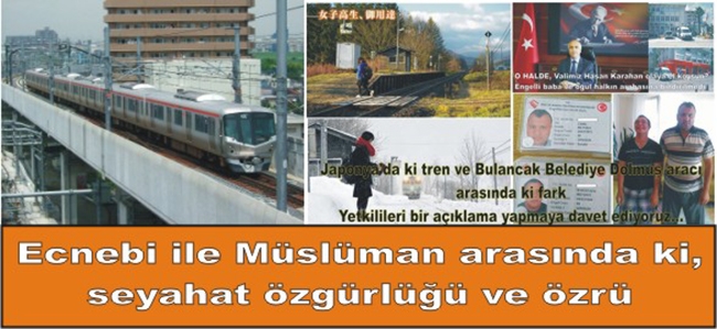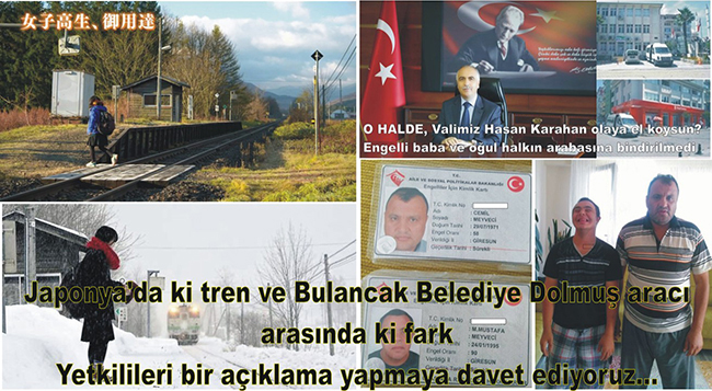 Bir devlet düşünün ki tek bir vatandaşı mağdur olmasın diye Lise öğrencisi bir kız vatandaşı için üç yıl boyunca hattın zararına işletilmesine karar veriyor. Hatta trenin istasyona geliş-gidiş saatleri, kızın okul saatlerine göre ayarlanıyor. Aynı devlette yaşanan başka bir olayda hiç kimse bu sebepten dolayı mağdur dahi olmaz iken trenin 20 saniye geç kalktı diye vatandaşına halkına açıklama yaparak özür diliyor. Hatta şirket 20 saniye geç kalkan trenden dolayı kimseden şikayet gelmediğini açıklayarak, o sabah erken kalkış dolayısıyla treni kaçıran olmadığını açıkladığı buna rağmen özür dileyerek, personelin bu tarz hatalar yapmaması için eğitim alacağını söyledi. Tüm bunlar Japonya’da yaşanıyor. Dünyanın bir ucunda bunlar yaşanırken Bulancak Belediyesi özellikle Engellilerin faydalandığı ve Sosyal Aileler Politika Bakanlığının yasalaştırdığı seyahat haklarını elinden alarak mevcut dolmuş aracını hattan kaldırıyor. 01.03. 2016 yılında( http://www.bulancakhaber.net/haber/2697/japonyada-ki-tren-ve-bulancak-belediye-dolmus-araci-arasinda-ki-fark.html) yaptığımız engellilerin ve bölge halkının yasal hakkı olan seyahat haklarını zarar ediyor diye verilmiş hak Bulancak Belediye tarafından yok sayılıyor. Bırakın özür dilemeyi Giresun valiliğinden, Aile ve Sosyal Politikalar Bakanlığı Giresun Aile ve Sosyal Politikalar İl Müdürlüğü, Bulancak kaymakamlığı ve Bulancak Belediye Başkanlığı tarafından hatta sivil toplum örgütlerinden hiçbir kurum ve kuruluştan ne bir özür nede bu konuyla ilgili olarak bir açıklama yapılıyor. bulancakhaber.net’in ö dönemde Bulancak’ta engeli vatandaşın yasal hakkı olan ve kanunlar gereği kamu hizmeti veren Belediye araçlarından ücretsiz yararlanmasına engel konulmakla kalmadığı daha da vahim olan ise engelli baba ve engelli oğlunun Belediye dolmuş aracına arabasına bindirilmediği halen ilk gün ki gibi içimizi acıtıyor. Özür beklenirken mevcut var olan Bulancak Belediye Giresun / Bulancak dolmuş hattı engellilere ceza niteliğinde seyahat özgürlükleri elinden alınarak kaldırılıyor. Şimdi dünyanın bir ucunda medeniyet ve önce insan anlayışı hak ve hakkaniyetten yana davranış biçimi bir tarafta ise yasal hakkın Bulancak Belediyesi tarafından ve Aile ve Sosyal Politikalar Bakanlığı’nın yasasını yok sayarak kaldırılan bir güzergâhtaki Belediye Dolmuş aracı. Nerede Adalet ve nerede Kalkınma.