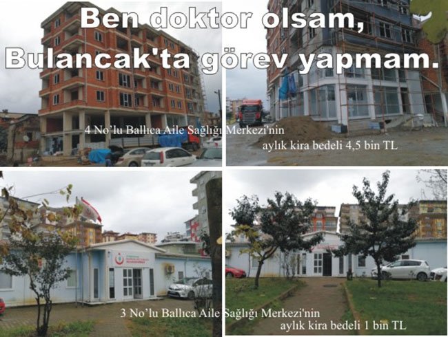 Bir tarafta kamu alanı içinde olup üzerinde ki prefabrik kamu hizmet binası 3 Nolu Ballıca Aile Sağlığı Merkezi’nin doktorları tarafından aylık kira bedeli 1 (bin) TL verilen hizmet alanı. Diğer tarafta ise bu 3 No’lu Aile Sağlığı Merkezi’ne 300-400 metre yakının da yeni Hükümet Konağının arkasında özel şahsin özel mülkü hem de inşaat halinde olan alana 4,5 bin TL kira verilen hizmet merkezi. Bu alanın iş güvenliği olup olmadığı oturma izninin olup olmadığı merak edile dursun kamu hizmeti verilen 4 No’lu Aile Sağlığı Merkezi alanının özel mülk üzerinde kamu hizmeti veren özel mülk sahibine dere kenarına aylık kira bedeli olarak doktorların 4,5 bin kira verdiği bir sağlık merkezi görünümlü alan. Ayrıca burada sağlık hizmeti almaya gelen birçok hastanın burasının nasıl bir sağlık ocağı olduğunu doktorların ve kendilerinin her an yaşanacak bir olumsuzlukla karşı karşıya kalabileceklerini söylediler. Bulancak İncüvez deresi kenarında binanın alt giriş katında Kamu hizmeti veren 3 No’lu ile 4 No’lu Aile Sağlığı Merkez’lerinin arasının 300-400 metre mesafede yakın olmasının derenin diğer tarafında kalanlara haksızlık yapıldığını söylediler. Derenin batı tarafında 3 tane sağlık ocağının oluşu ve doğu tarafında bir tane sağlık ocağının şehir merkezinde olmasını ilçenin gelişimine ve dağılımına göre bu merkezin yapılmadığını belirttiler. İşte tamda burada bulancakhaber.net olarak aynı bölge de bulunan kamu alanı içine var olan işletme, yeni yapılan bir dernek ve yine kamu alanı içinde bulunan 5 yıldızlı yeni yapılan otel görünümü niteliğinde Müftülük binasının görkemli ve ücretsiz kendilerine sunulması bizleri çok şaşırttı. Bu nedenle doktor olsam Bulancak’ta görev yapmam dediğimiz nokta da kirasını ödediğini öğrendiğimiz doktorlarımızın zarar gördüğüm bir işletmede çok fazla kalmaz dedirtti.